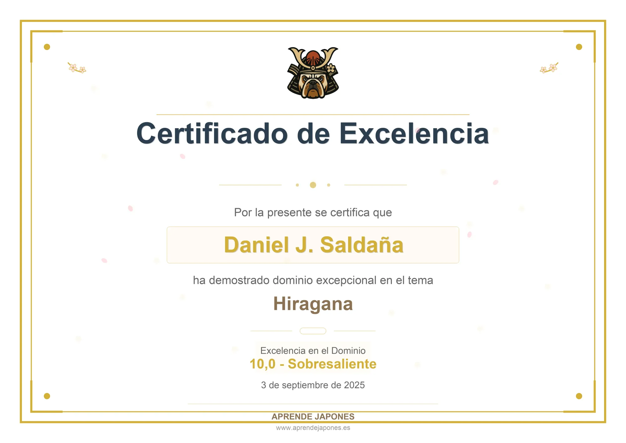 Aprender japonés lleva tiempo, requiere constancia y mucha práctica. Por eso creemos que cada logro merece ser celebrado y registrado. A partir de hoy, cada avance queda reflejado en un certificado que podrás guardar, compartir o simplemente coleccionar como parte de tu camino con el idioma.