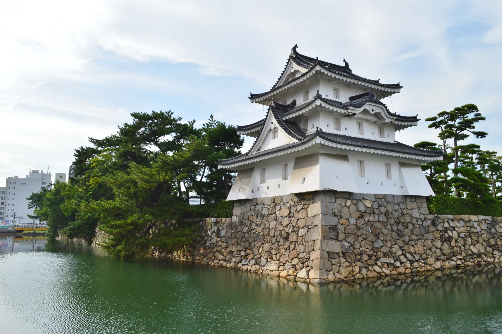Cerca del puerto, visitamos las ruinas del Castillo de Takamatsu. Este castillo es único (Mizujiro) porque sus fosos no están llenos de agua de río, sino de agua de mar. Están conectados directamente con la bahía, por lo que, si miráis al agua, no veréis carpas koi, sino besugos y peces de mar nadando alrededor de las murallas.