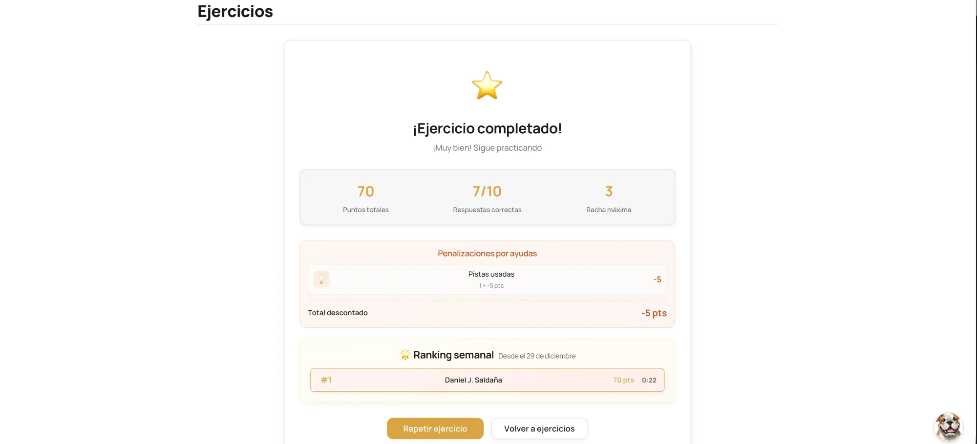 - Reporte final detallado: hemos mejorado el resumen al acabar el ejercicio para que veáis claramente los puntos ganados y los perdidos.