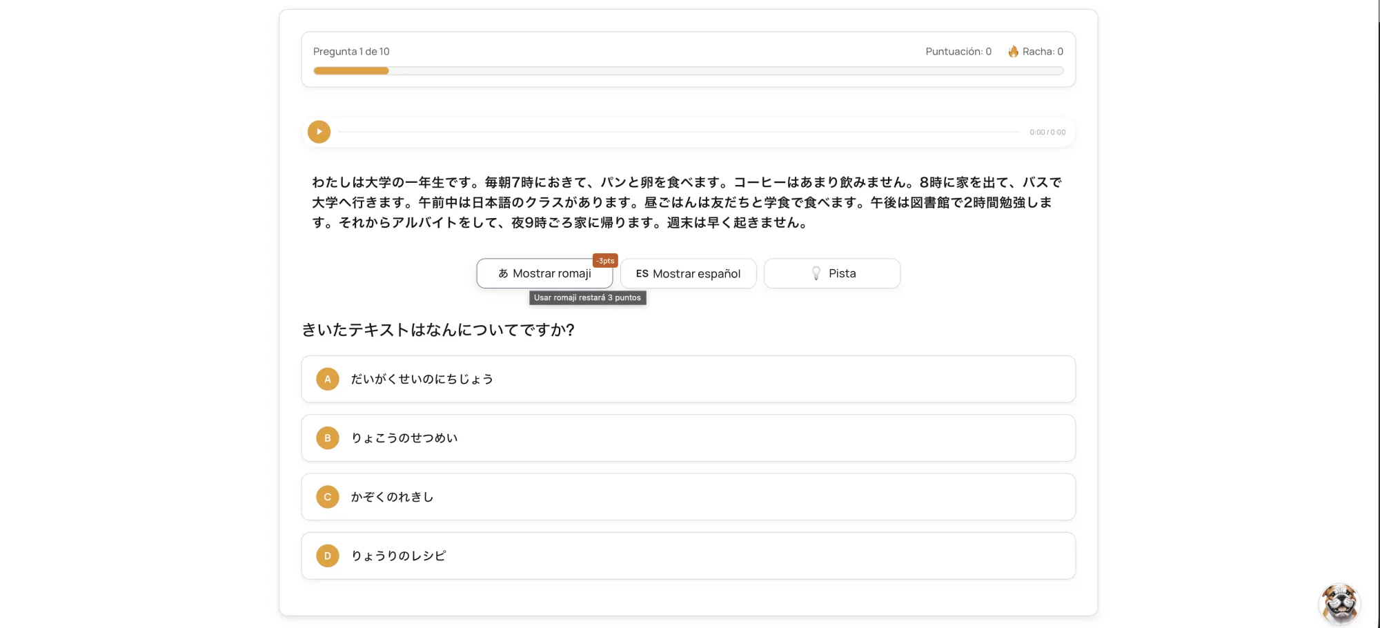 Estrenamos nueva sección de ejercicios y retos de pronunciación. Regístrate gratis, compite en el ranking y gana trofeos. ¡Mejora tu N5!